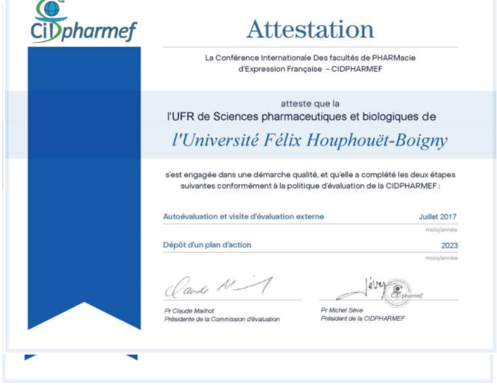La Conférence Internationale des Facultés de PHARMacie d'Expression Française (CIDPHARMEF) a reconnu les efforts de l'UFR Sciences Pharmaceutiques et Biologiques de l'Université FHB pour s'engager dans la démarche qualité et lui a accordé une attestation à cet effet